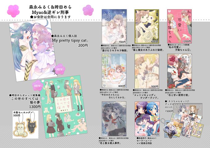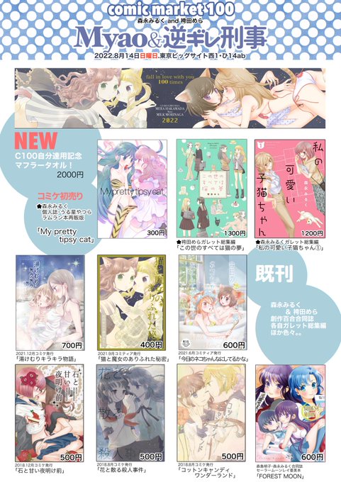 明日8/13(日)コミケ2日目に参加します。西1む38ab「Myao」袴田めらさん「逆ギレ刑事」と隣接合同会計です。 新刊はありませんヽ(;▽;) 子猫ちゃん2巻の再販分があります。 あとイラストサイン本作れたら持って行きます。 #コミケ102お品書き #C102