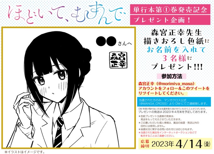本日4月7日㈮単行本1巻発を記念して描き下ろし色紙のプレゼント企画を実施するとの事です! 応募方法は 1、このアカウント(@morimiya_masa)をフォロー 2、このツイートをリツイート 〆切は4/14㈮です! ※当選DMは俺からじゃないので注意して下さい! よろしくお願いします!