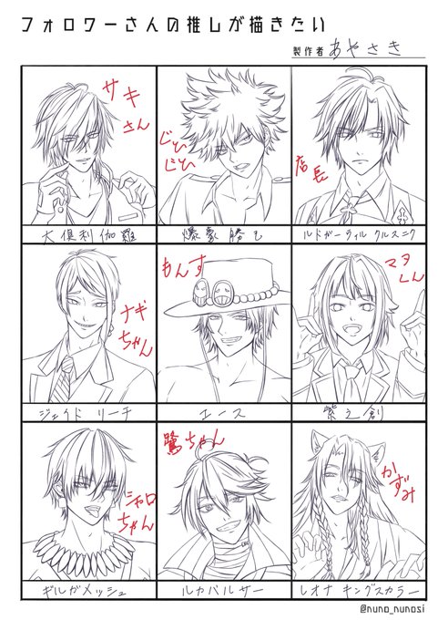 #フォロワーさんの推しが描きたい ありがとうございました^~ 時間に余裕が出来たら線画と色も塗っておきます…🙏 7割ほど初描きの子だったので楽しかったです 3枚目はどっちか描いて~の子と色々