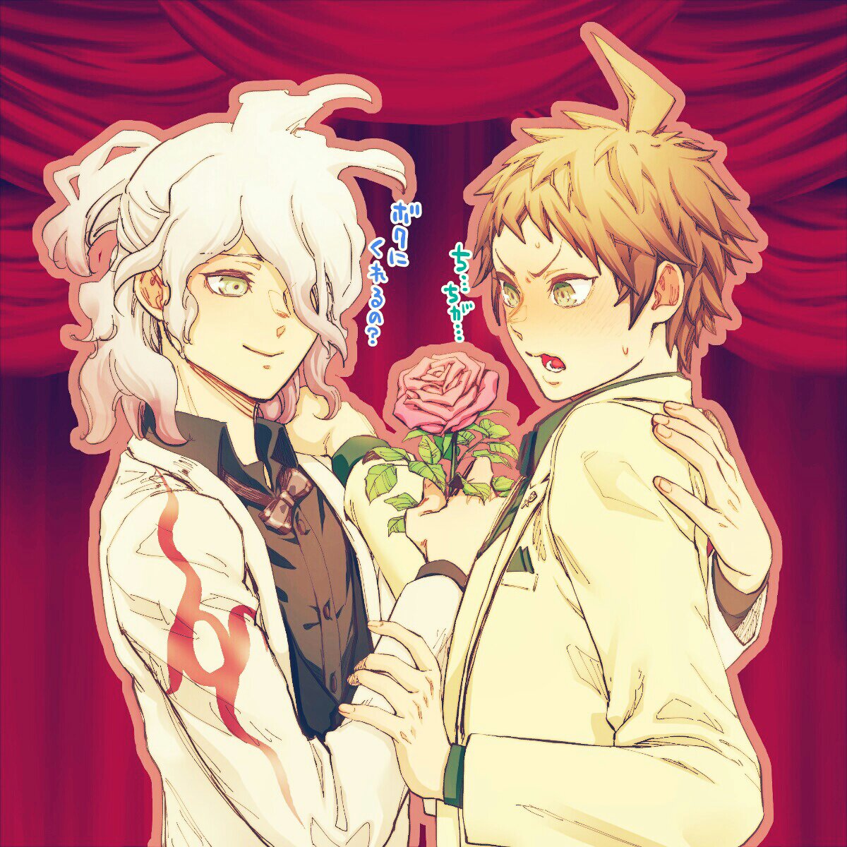 おめかし狛日。 日向くんがバラ持ってるの可愛いし狛枝のハーフアップも良いんじゃあぁ~✨