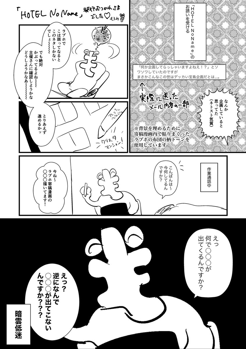 こは斑合同誌「HOTEL NoName」(@hotel_noname)執筆中のレポ漫画を描きました🏩お誘いありがとうございました!賭けは大惨敗で〜す🫠