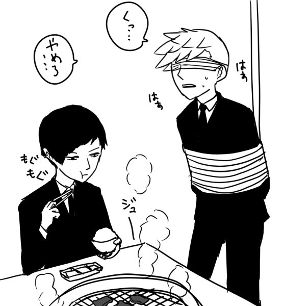 57 237 目隠し拘束されて辻ちゃんに焼肉を食われる犬飼くんを描きました。(辻犬) 19/01/13 23:35