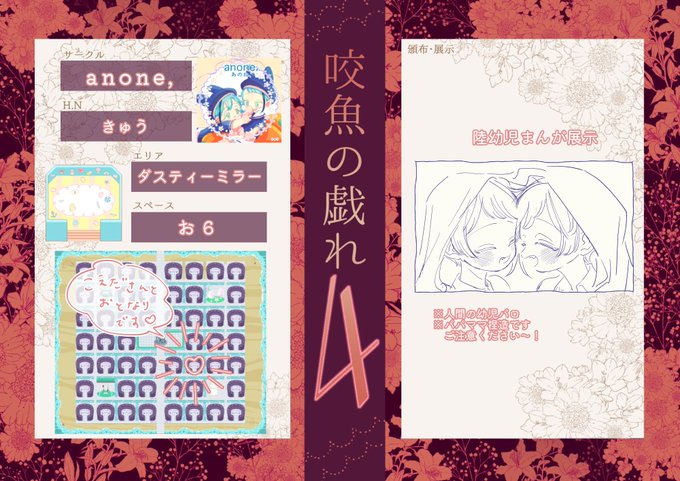 20 57 #咬魚の戯れ4 開催おめでとうございます💐 「ダスティーミラー:お6」でスペースをいただきました。 展示のみの参加です、よろしくお願いいたします☺🌟 23/06/15 23:19