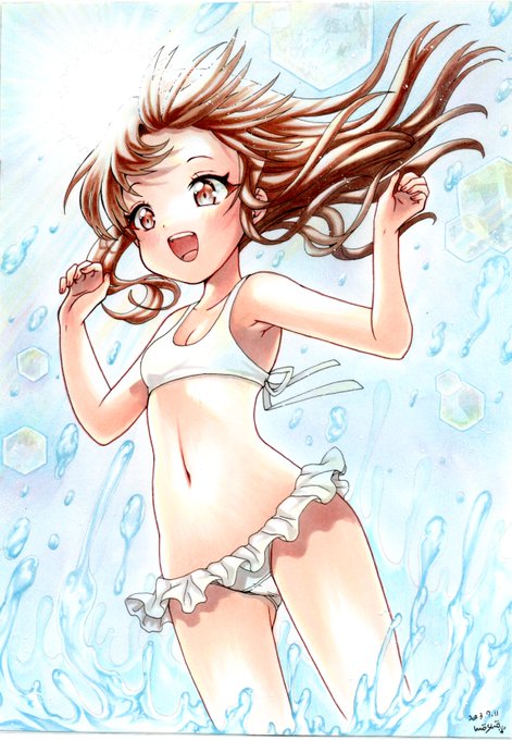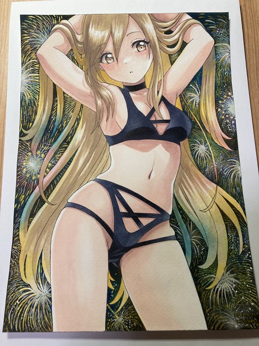 1 8 花火と水着 背景金色も使ってます #アナログイラスト #オリジナル 23/08/11 18:41