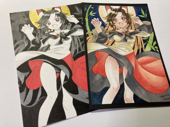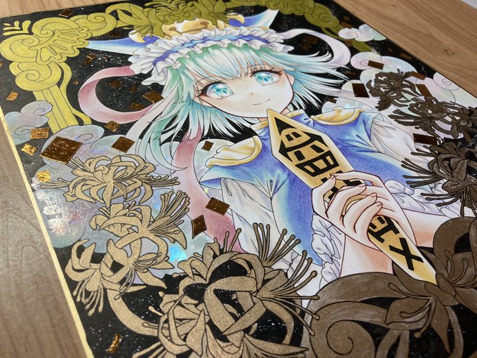 ポストカードサイズでカット売りされてるの 水張り出来ないしどう使うかなと悩んでたやつ 全部ブロック化した 水たっぷりでも大丈夫やった 厚みある中で描くから色紙の時の楽しさもあるし ギリギリまで縁攻めれるし 水たっぷりxドライヤーもokだった 剥がした後もピンとしてる😆👍 #アナログ絵 #東方