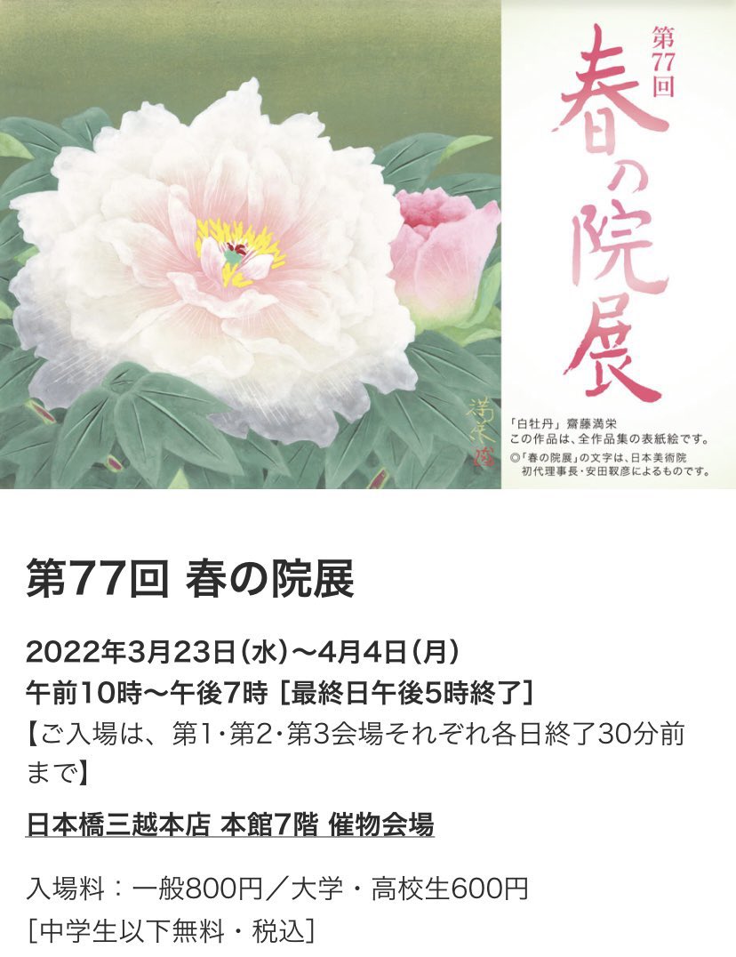 9 77 ◯展示のお知らせ◯ 第77回春の院展 3/23〜4/4 日本橋三越本店 本館7階催物会場 この度春の院展にて奨励賞を頂きました 葛の垂れた茎を帳(カーテン)に見立て、その空間に潜む雀たちを描きました 色々ハプニングもありましたがなんとかなってよかった… ご無理のない範囲で宜しくお願い致します 22/03/19 19:02