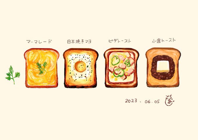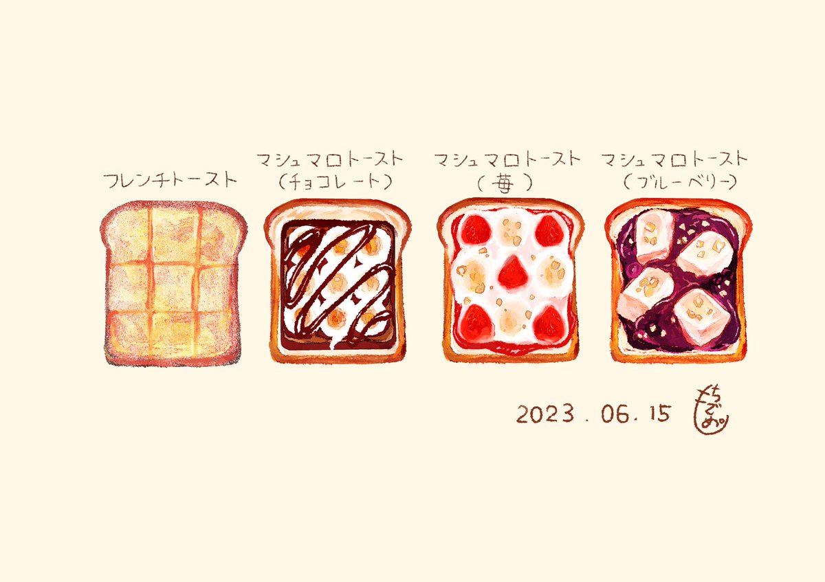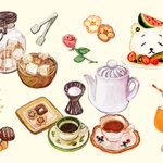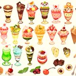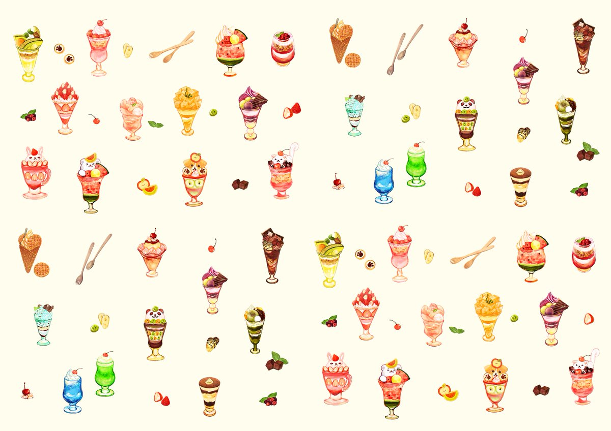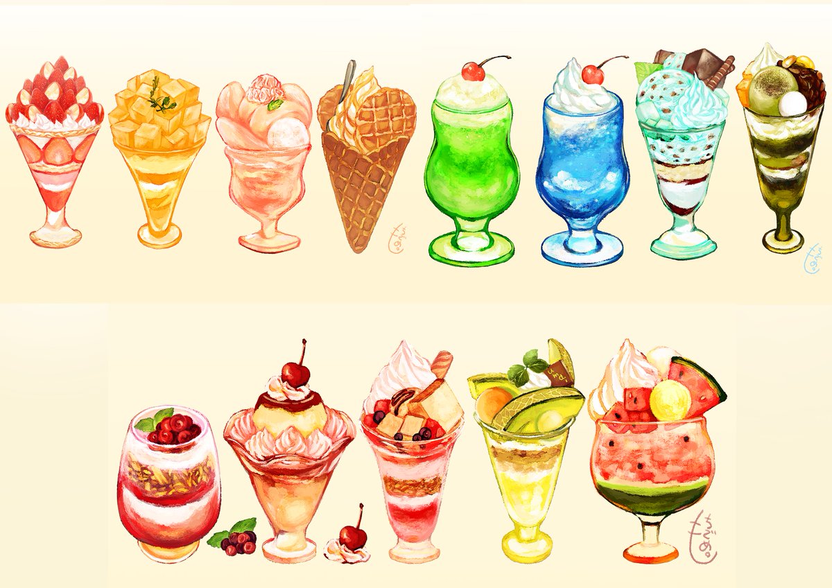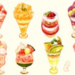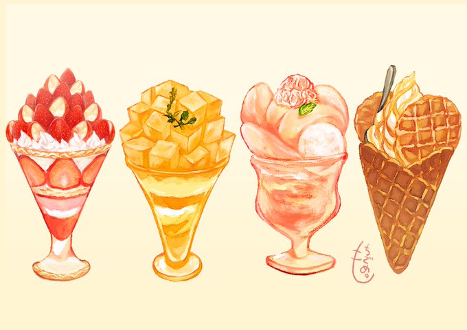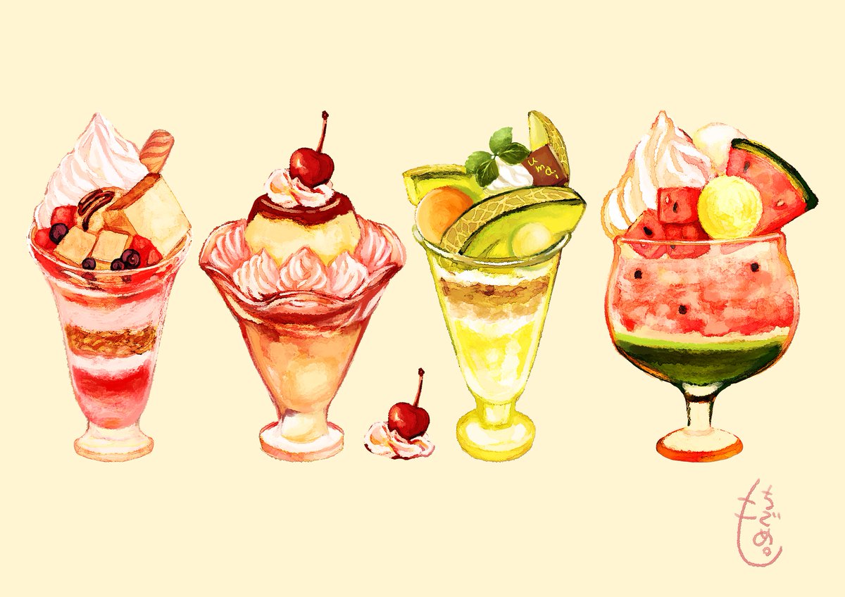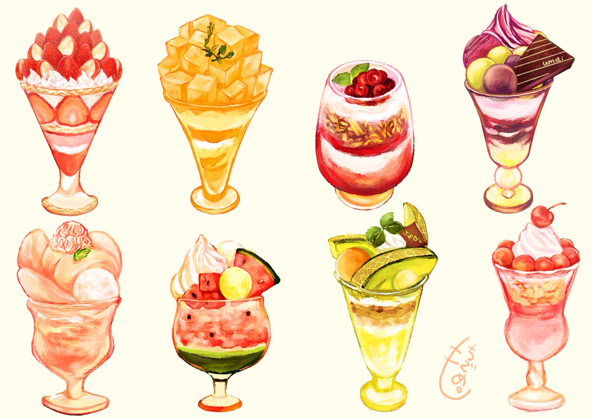 左から「苺パフェ」「マンゴーパフェ」「桃パフェ」「ハニーワッフルパフェ」🍓🥭🍑🍯になります。 今回はフルーツ多め。 #夏の創作クラスタフォロー祭り #illustration #絵描きさんと繋がりたい