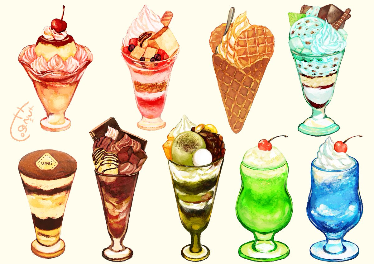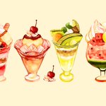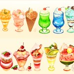 左から「メロンソーダパフェ」「クリームソーダパフェ」「チョコミントパフェ」「宇治抹茶パフェ」🍈🍒🍫🍡になります。 配色彩度の幅ありすぎて大変だったな…! 最近はおいしいもの描いてます。 #illustration #イラスト好きな人と繋がりたい #7月になったのでフォロワーさんに自己紹介しようぜ