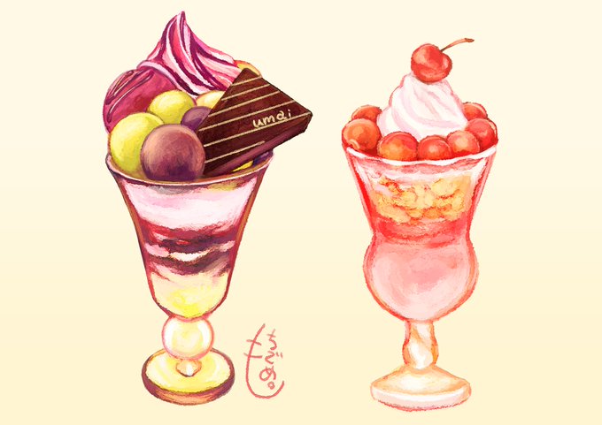 実はpixivさんにパフェのイラストを5つ投稿していたのですが、そのどれもが100users入り頂けたようです🍒とても嬉しい…! #もちごめいらすとれーしょん #ゆるいイラスト #ゆるい絵 パフェ🍒 | もちごめ。 #pixiv pixiv.net/artworks/99520…