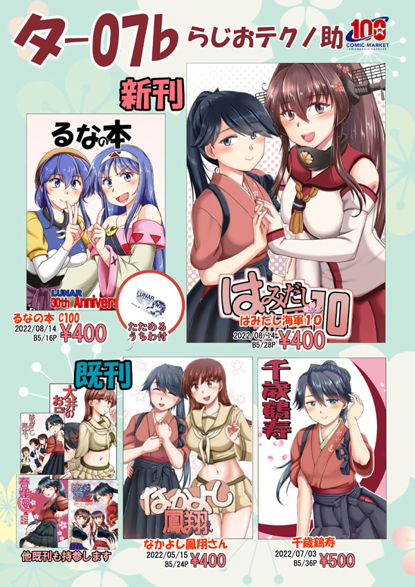 32 46 よいよ開催されます夏コミ(C100)のお品書きです。新刊は2冊 艦これとLUNARになります。先日の鳳翔さんオンリーの新刊とそれまでの既刊もあります! 日曜タ-07b「らじおテクノ助」よろしくお願いします~!(LUNARは一応バラでも頒布する予定です 22/08/12 22:45