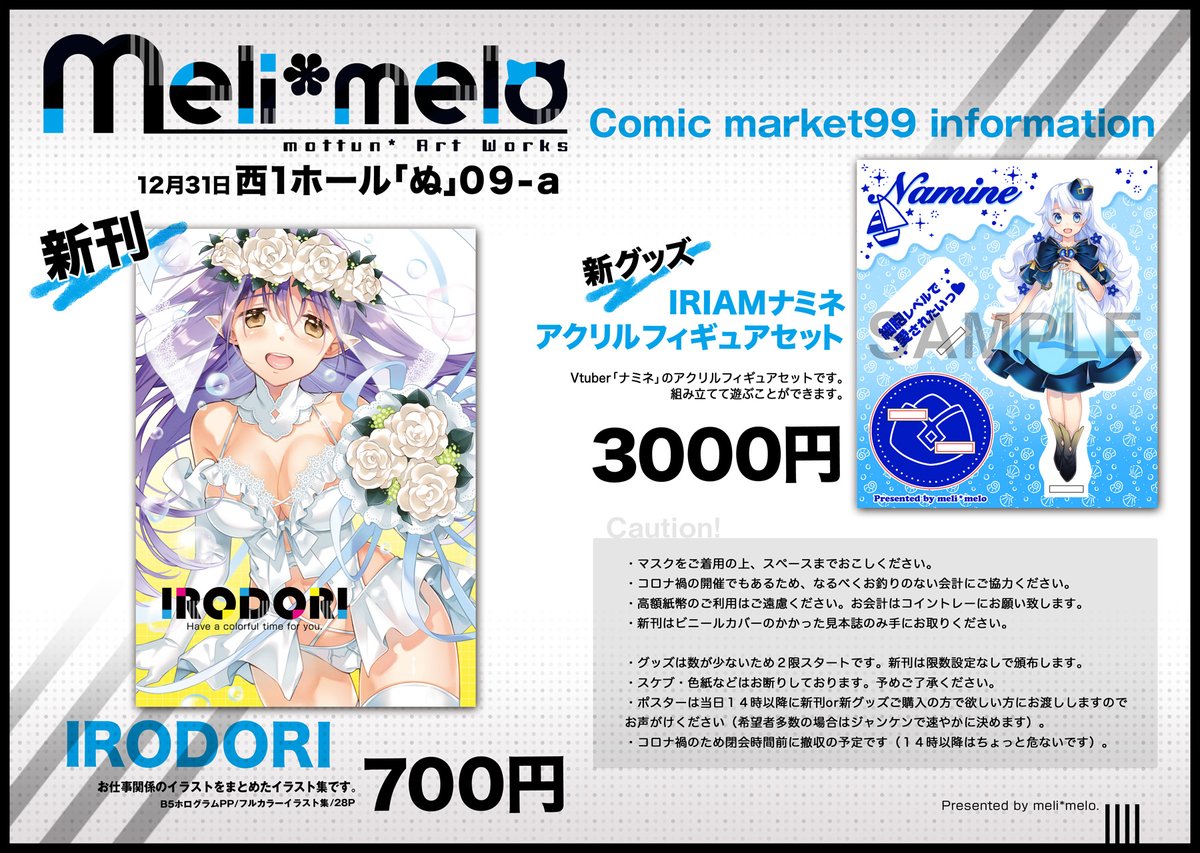 コミケ99の場所とお品書きと通販情報です!どうぞよろしくお願い致します!! 【スペースNo.2日目(31日)ぬ-09a「meli*melo」】 webcatalog-free.circle.ms/Circle/15706926 #C99WebCatalog 【通販】 melonbooks.co.jp/detail/detail.… #C99お品書き #C99新刊 #C99