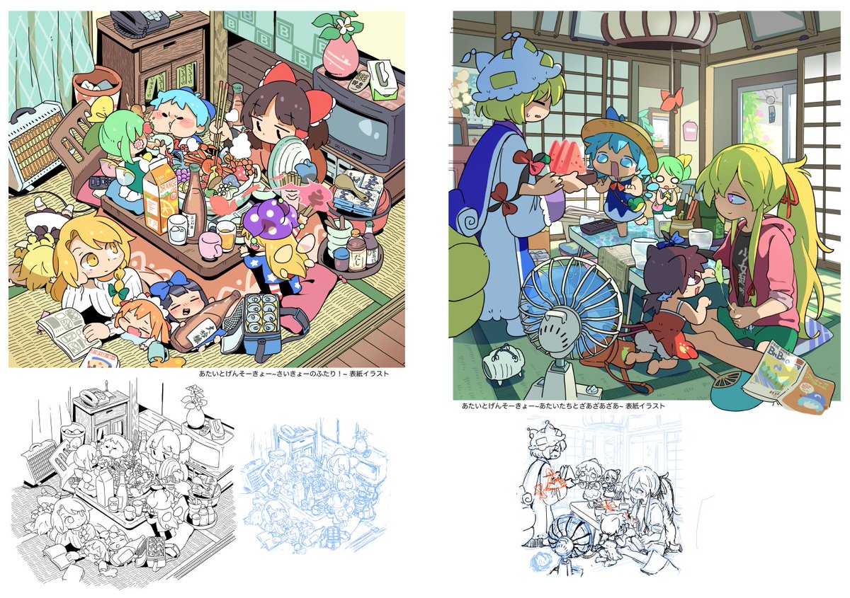 【告知】 例大祭新刊2冊目、「あたいと〜」シリーズのイラスト・俺設定資料集です 自分の東方漫画での主要キャラのビジュアル設定や、今までの表紙や扉イラスト、昔に出した無印版の再録などやりたいこと全部詰めた感じの本です こちらは会場頒布のみです B5/70p(一部乱丁あり・ツリー参照)/1500円