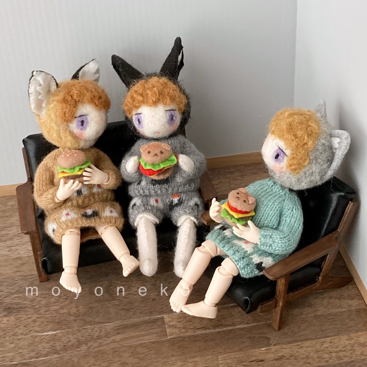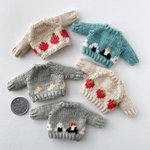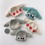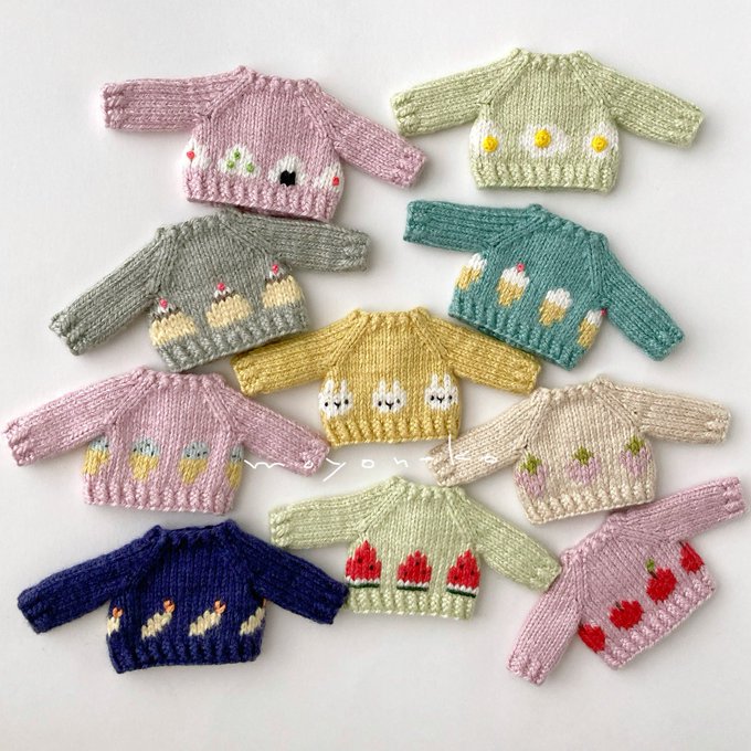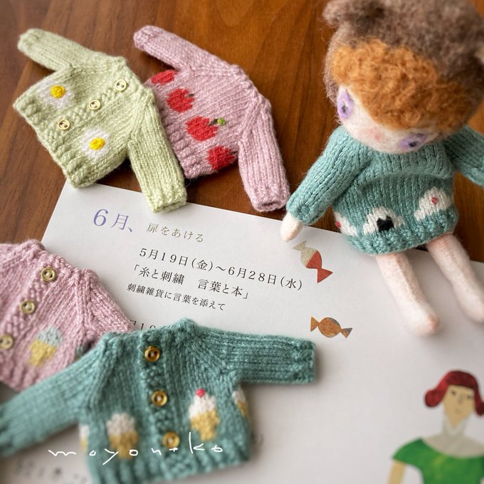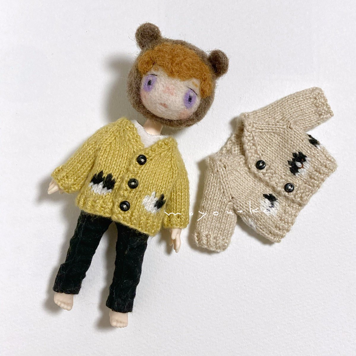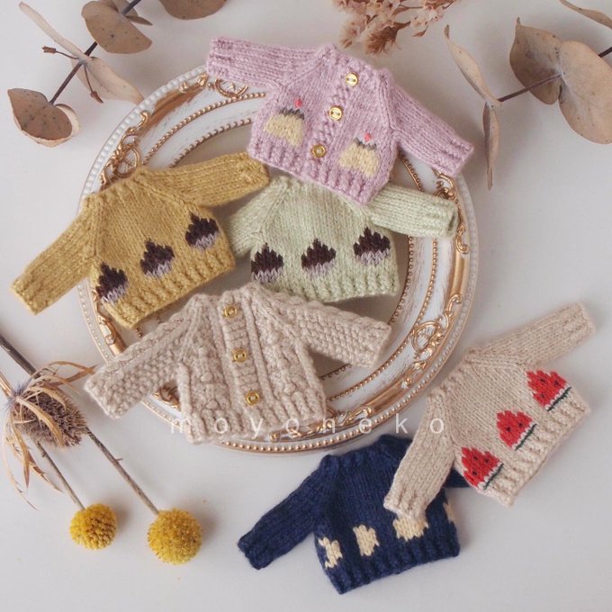 フェルトなどの素材の手足が動かせるお人形、1/12くらいのニット制作してます。 (2枚目のお人形はボディも自作のもの、4枚目写真のお人形はヘッドは自作でボディはオビツ11です) 10月中にminneでちいさなニットの販売を予定しています🧶 minne.com/@moyoneko Thanks! @Lupopo_cafe さま