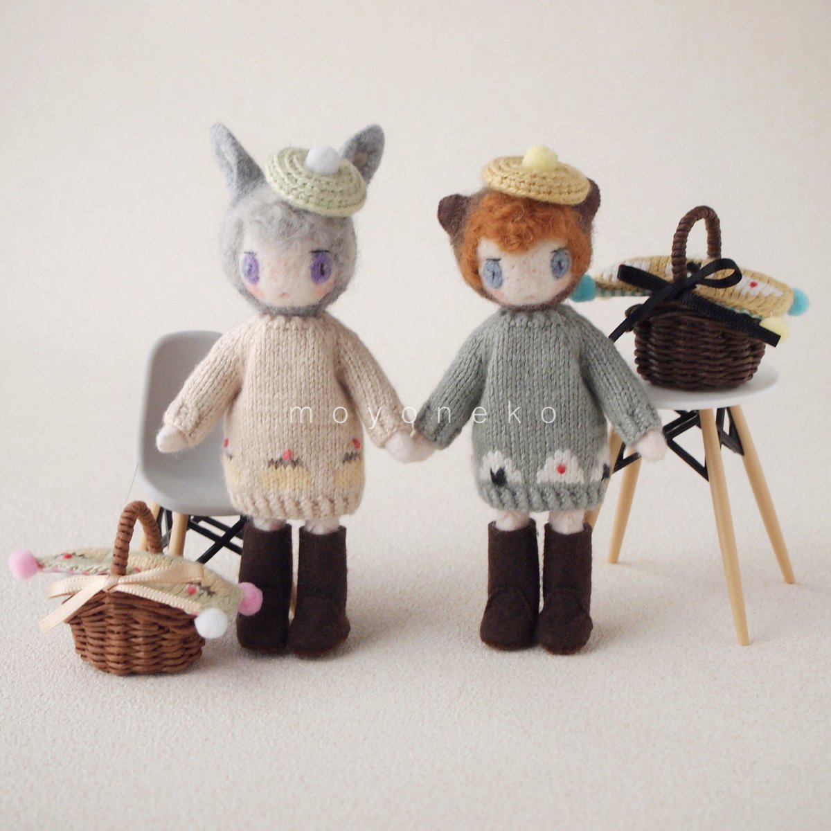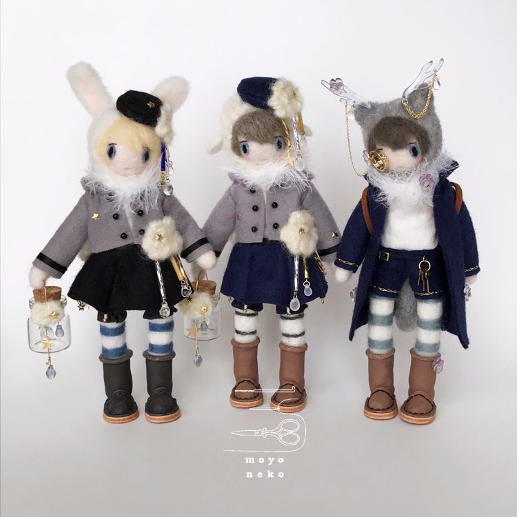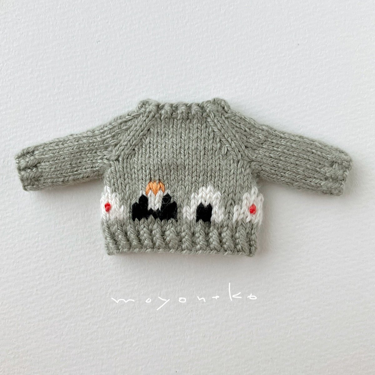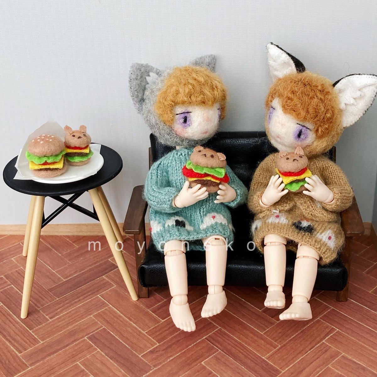 フェルトなどの素材の手足が動かせるお人形、1/12くらいのニット制作してます。 (2枚目のお人形はボディも自作のもの、4枚目写真のお人形はヘッドは自作でボディはオビツ11です) 10月中にminneでちいさなニットの販売を予定しています🧶 minne.com/@moyoneko Thanks! @Lupopo_cafe さま