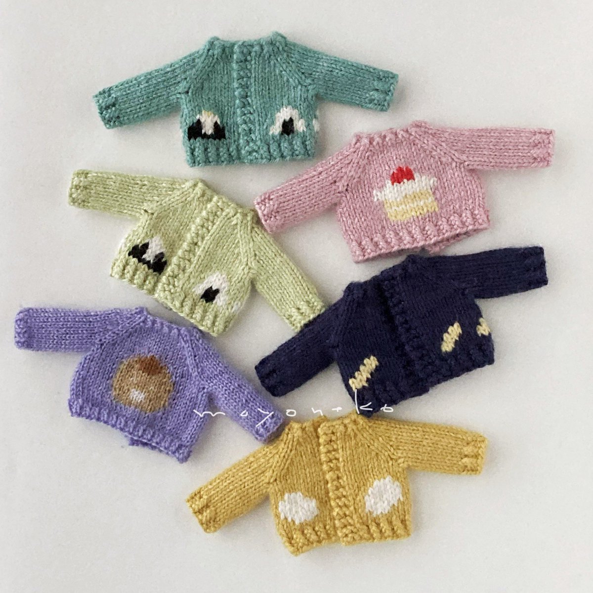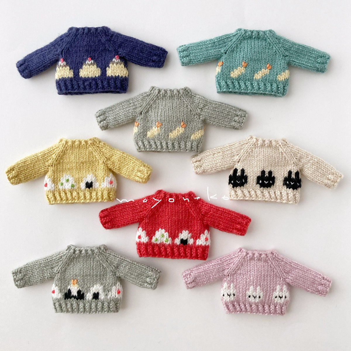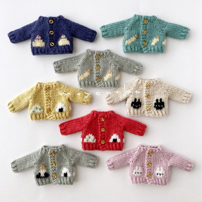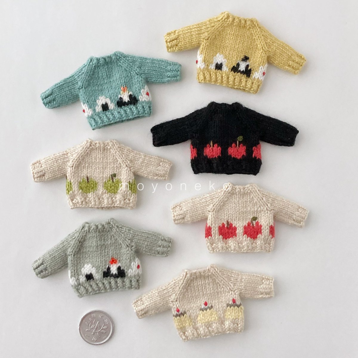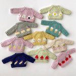 編み上がっていたちびセーターたちを仕上げましたー! 楽しい食べ物柄を揃えております🍙 細かくてわかりにくいのですが後ろのボタンも柄に合わせてひとつひとつ作りました #オルソのおいしい雑貨店