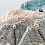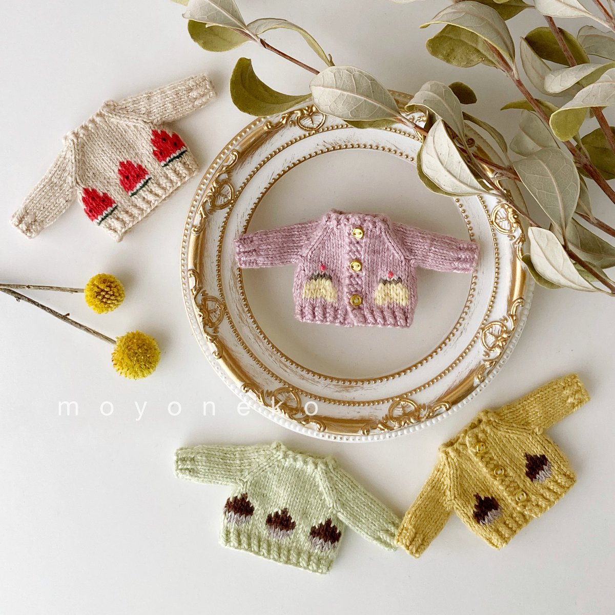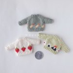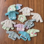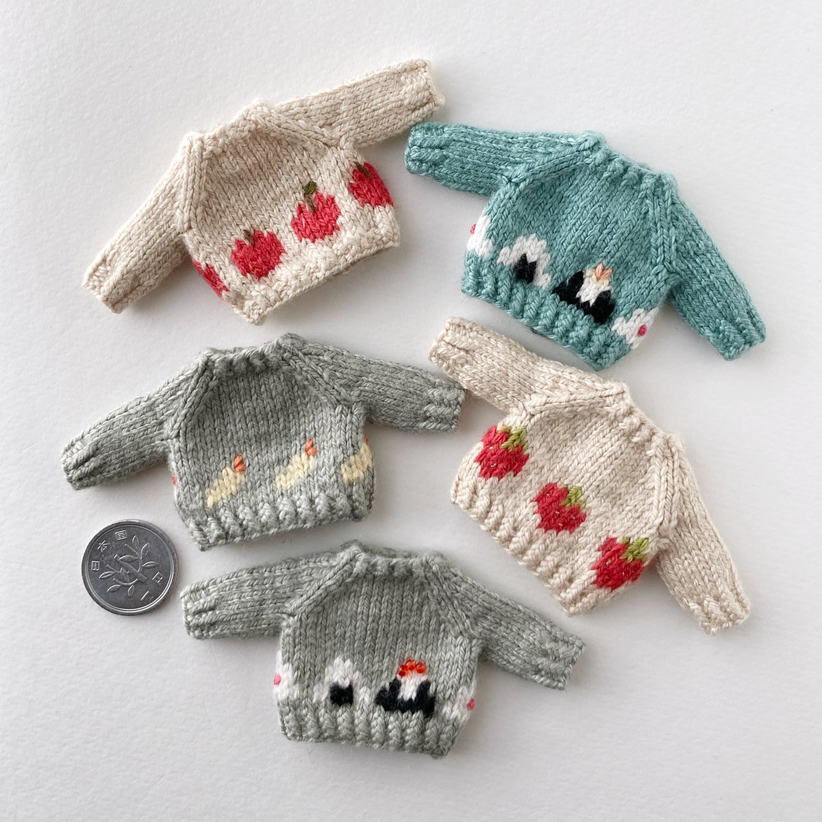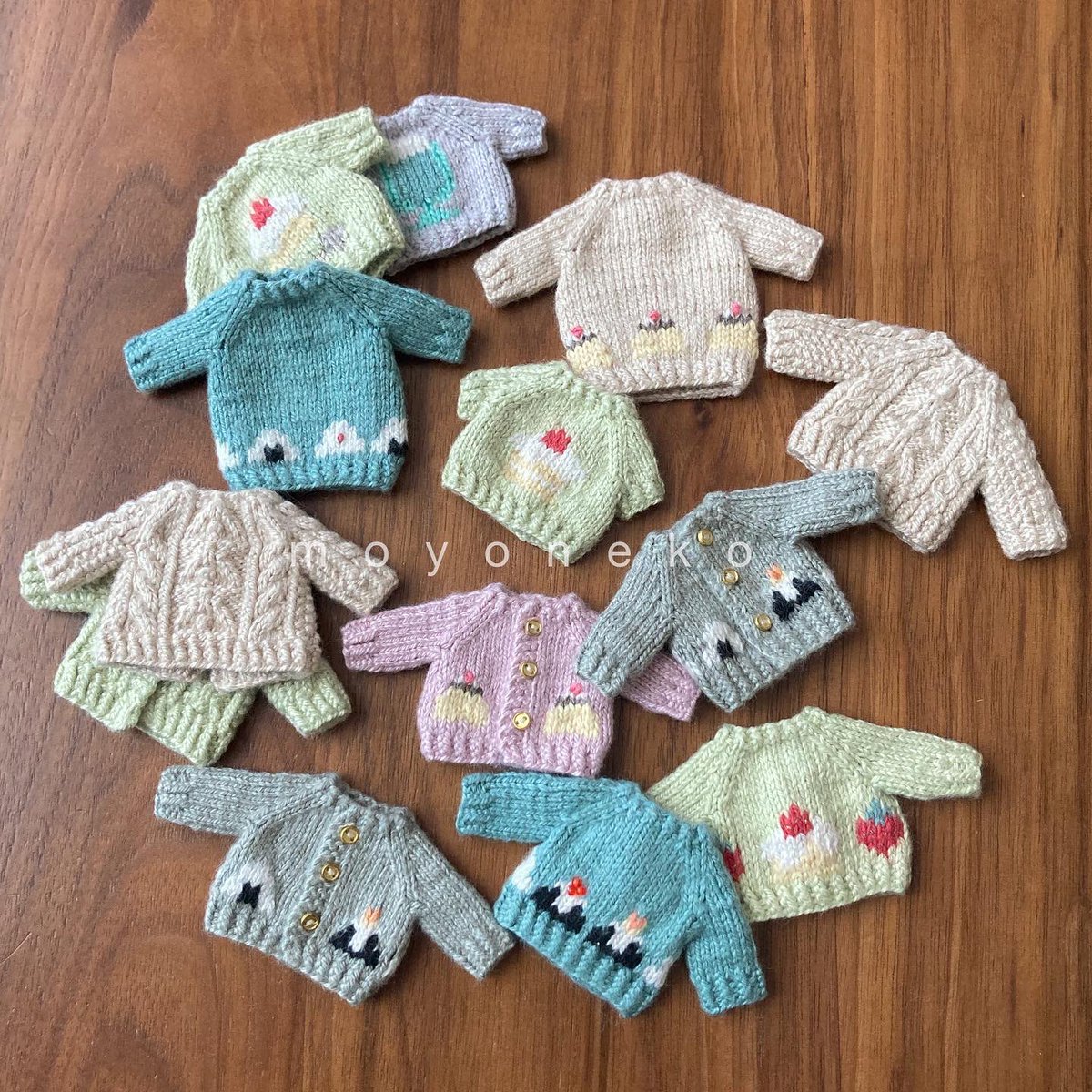 編み上がっていたちびセーターたちを仕上げましたー! 楽しい食べ物柄を揃えております🍙 細かくてわかりにくいのですが後ろのボタンも柄に合わせてひとつひとつ作りました #オルソのおいしい雑貨店