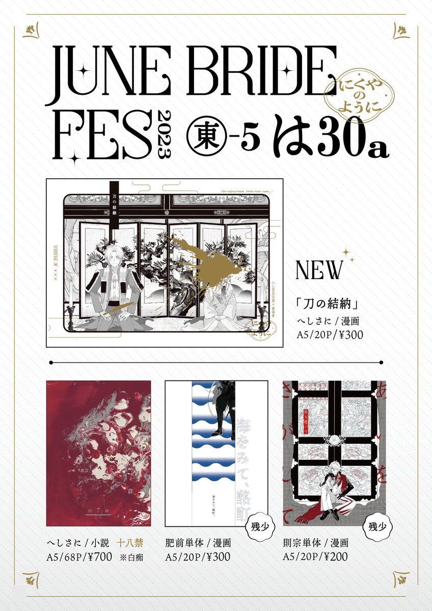 ꪔ 6/25 JUNE BRIDE(ジュンブラ) ꪔ お品書きとポスタ〜 まぁまぁデカく刷ったので目立つかと… よろしくお願いします ✴︎ pixiv pixiv.net/artworks/10924…