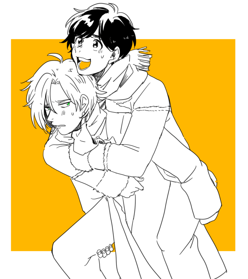 腰を痛めた私が道で滑って転んで腰を痛めたであろう奥村英二くんをおんぶするアッシュリンクスを描きました