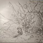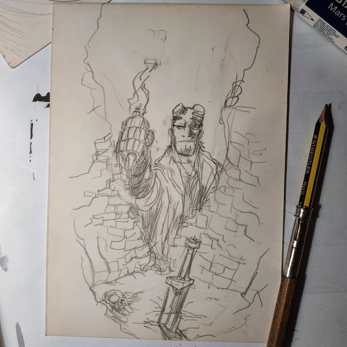 Sketching my next #inktober day 24, dig. I wanted to draw an Hellboy but, damn, his face is hard. 😅 Still working on it 😎💪🏼 (making foto and flip it shows immediately what doesn't work and here's a lot 🤦🏽♂️🤷🏽♂️) #sketch #sketches #comics #inktober2020dig #inktoberday24 #hellboy