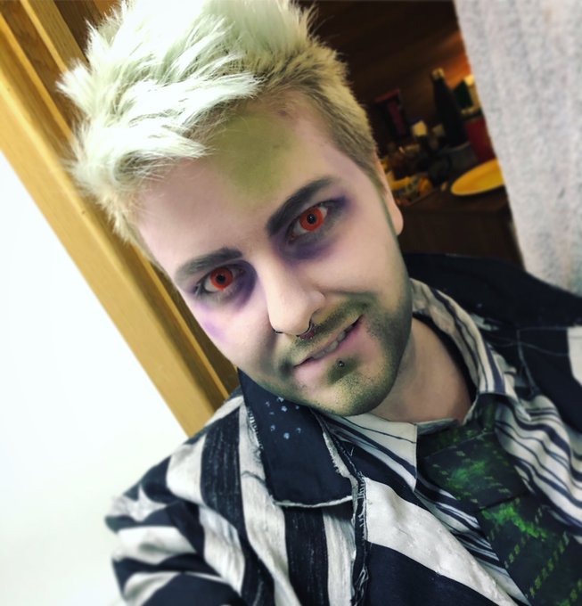 My contacts for Beetlejuice came in today, so I couldn’t resist doing a makeup test for BJ! Still need to dye my hair, sew the trousers and finish weathering, but super proud of this so far! 🖤👻 @BeetlejuiceBway @ABrightMonster #beetlejuice #cosplay