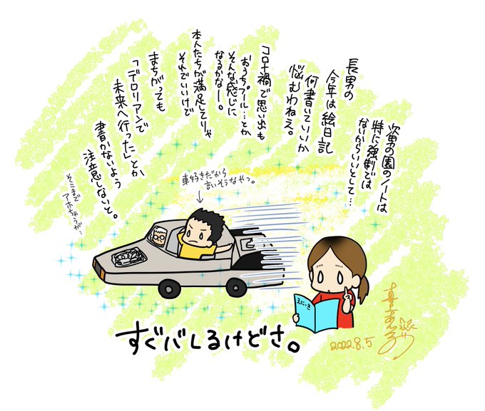 3 15 うちの子は何でも思い出にするタイプだが… #長男 #絵日記 #悩む #プール #宿題 #小学校 #夏休み #小学生一年生 #デロリアン #バックトゥザフューチャー #車 #車好き #車下手 #真上あん子 #落書き #呟き #イラスト 22/08/05 09:11