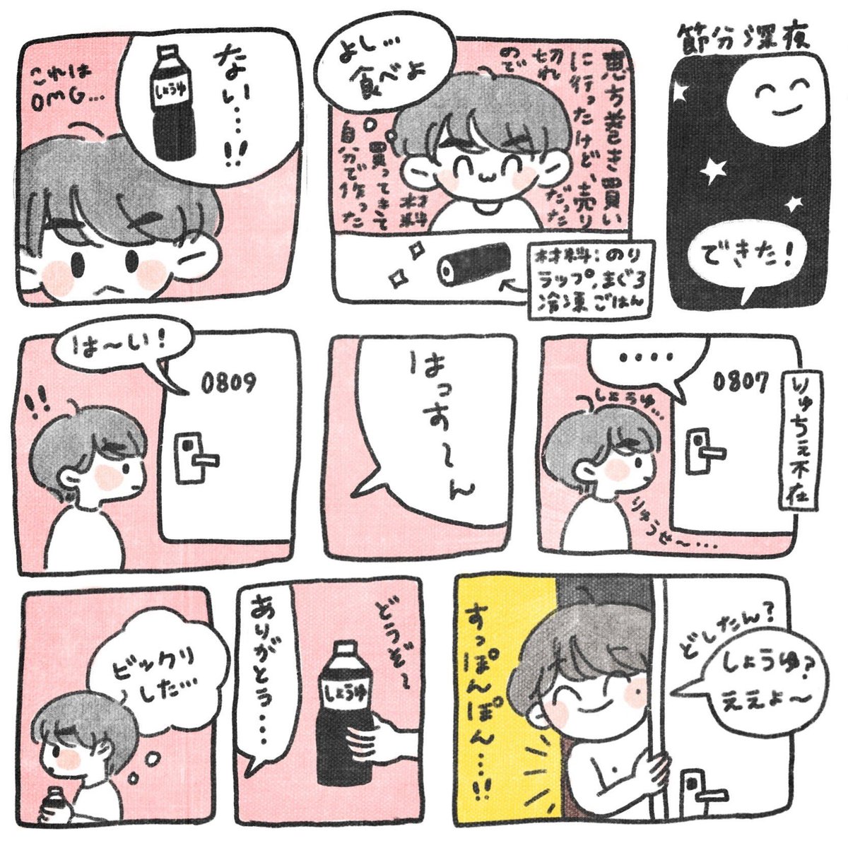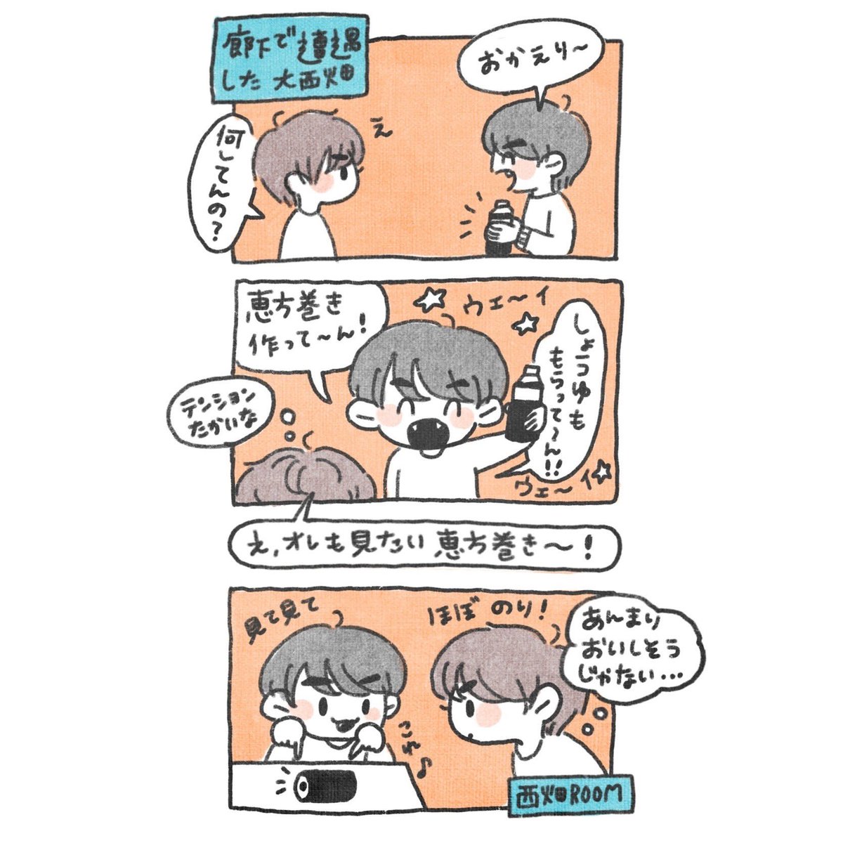 節分の深夜に自作した恵方巻きを食べるために大橋くんにお醤油を借りてウェーイ⭐︎な西畑くんと深夜帰宅した大西くんが廊下で遭遇したお話し。#なにわ男子ANNP