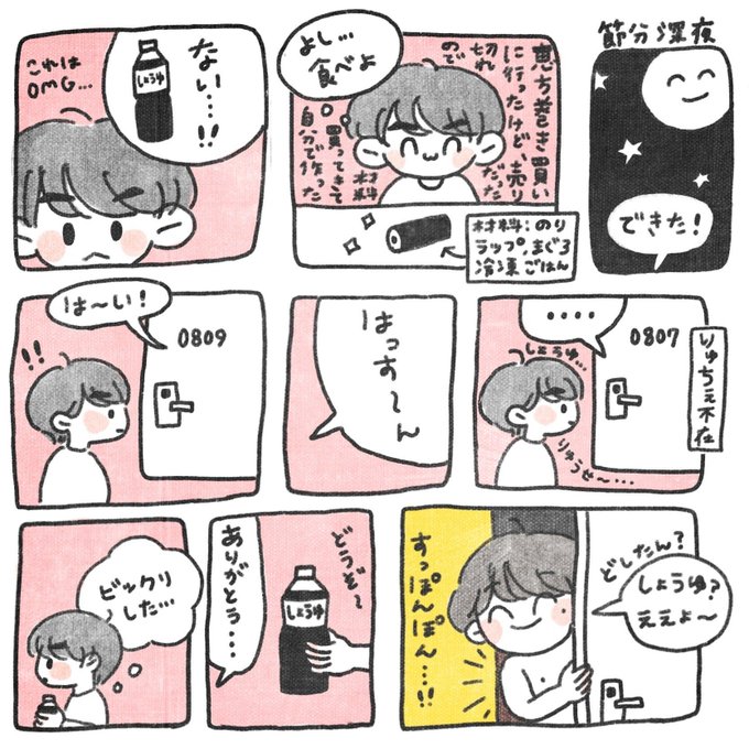 20 147 節分の深夜に自作した恵方巻きを食べるために大橋くんにお醤油を借りてウェーイ⭐︎な西畑くんと深夜帰宅した大西くんが廊下で遭遇したお話し。#なにわ男子ANNP 22/02/14 18:42