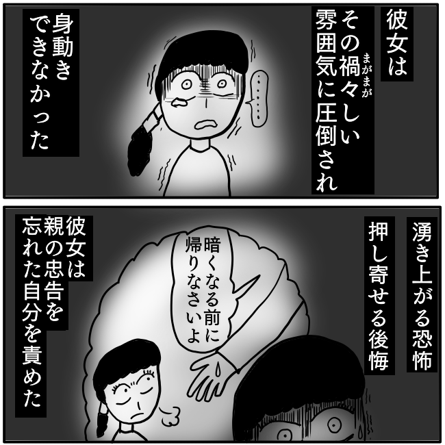 【実録ホラー漫画】 夕闇に迫るもの…④ 少女が目の当たりにした、ある怪異 #ホラー漫画 #漫画が読めるハッシュタグ #漫画 #怖い話 #オカルト #ホラー