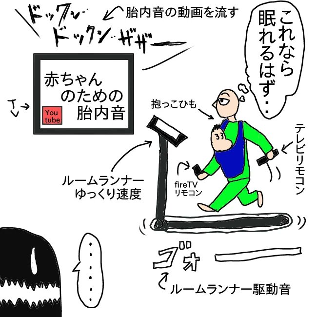 【再掲】 ランニングマシンを用いた一歳児寝かしつけ…。良いお父さんは真似しないでください(笑) #イラスト #漫画が読めるハッシュタグ #育児漫画 #絵日記 #子育て #エッセイ漫画 #コミックエッセイ