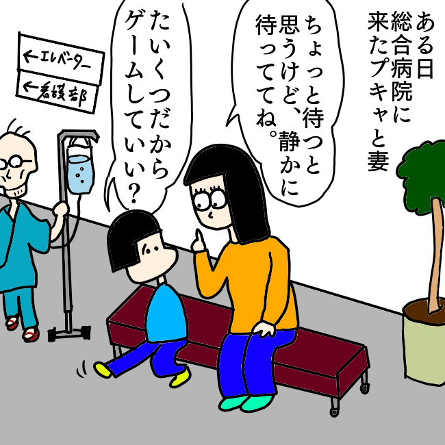 再掲 病院待合にて、ゲームで診察待ちする息子と妻の攻防… #漫画が読めるハッシュタグ #漫画 #エッセイ漫画 #子育て #育児漫画 #育児絵日記