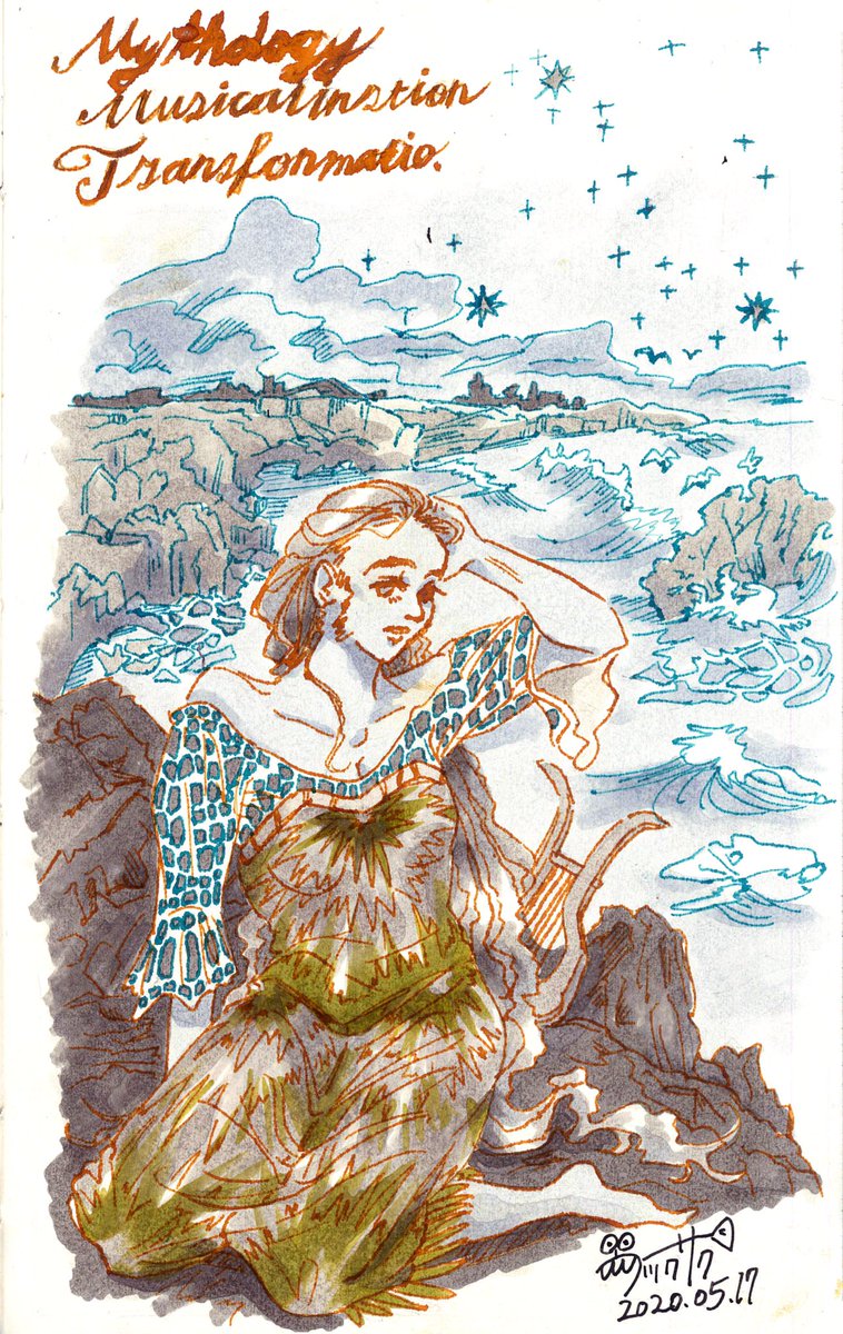 0 2 ワードカードシャッフルでお題イラスト 『神話』『楽器』『変態』 一番最初の琴は亀から作られたとか… #イラスト #デザイン #アート #コピック #背景画 #神話 #オルフェイス #琴座のベガ 20/05/21 13:40