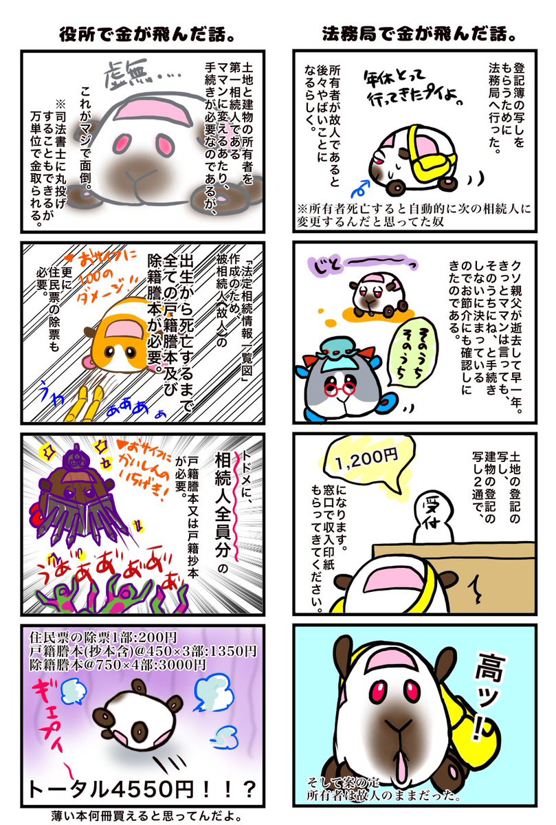 実録漫画。家と土地の権利者をママンにすべく奔走しています。「法定相続情報一覧図」さえ作成できれば後は無双できるので頑張るぞい(白目) ※代理はヒマラヤンちゃん、ママン代理はばぁや。 #モルカーファンアート