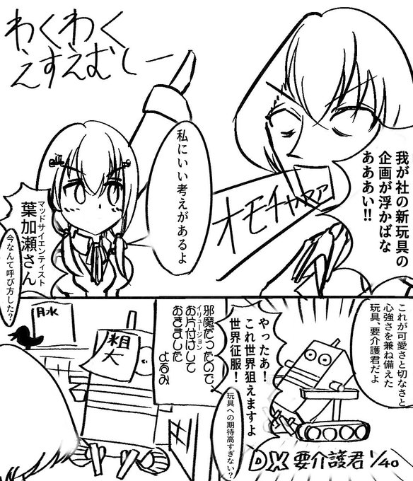 昨日久しぶりにBesiegeのコラボ配信見て思い浮かんだ葉加瀬と社長中心のすめし漫画です #加画美 #はかせレポート