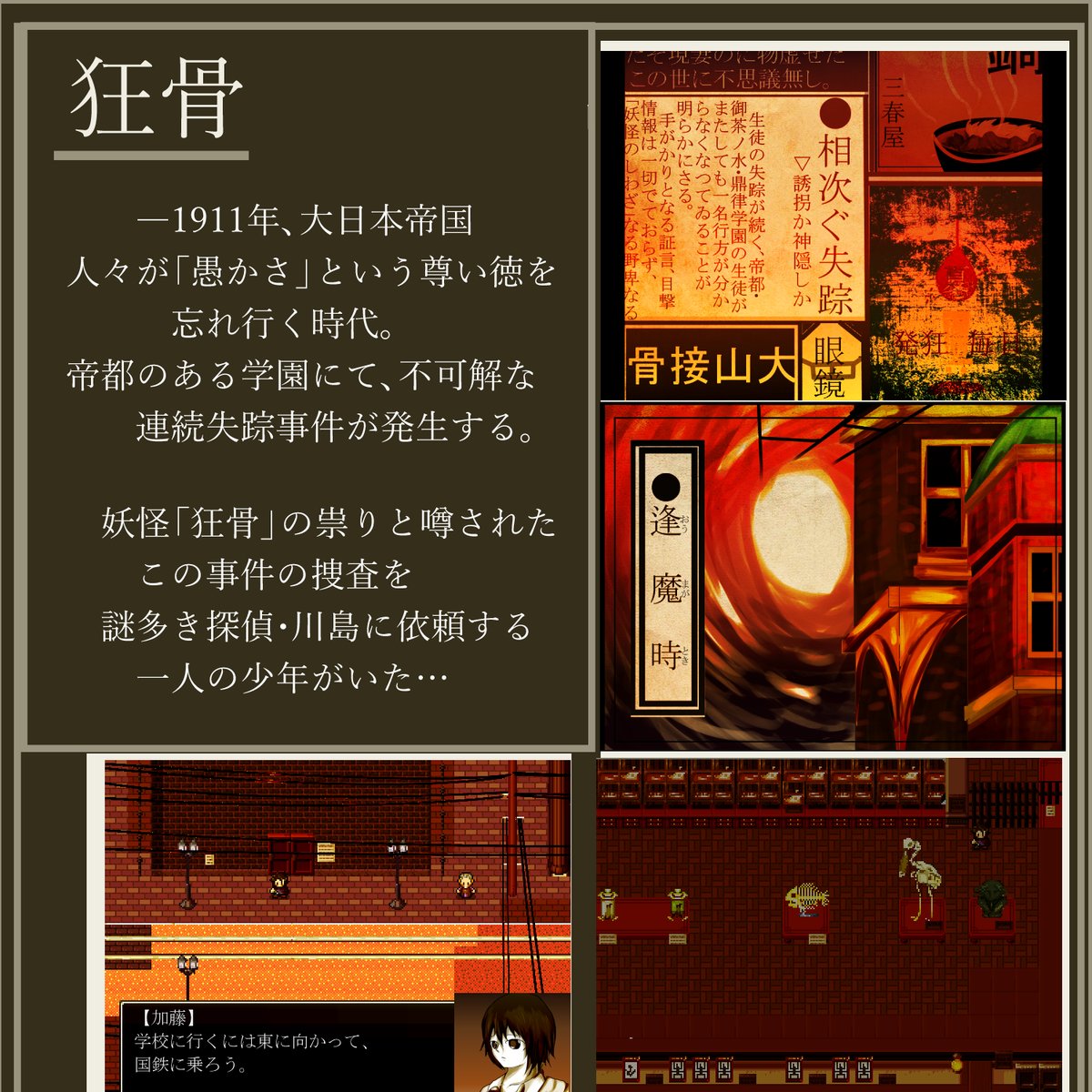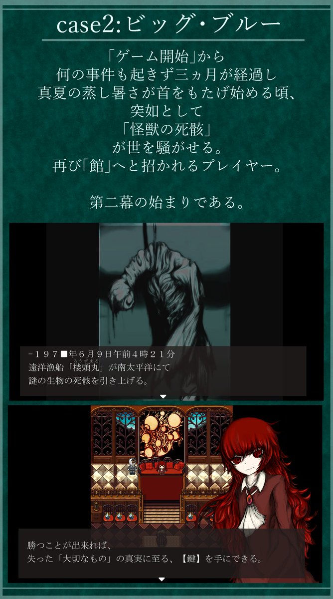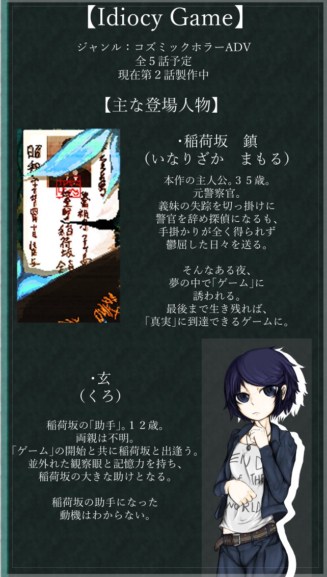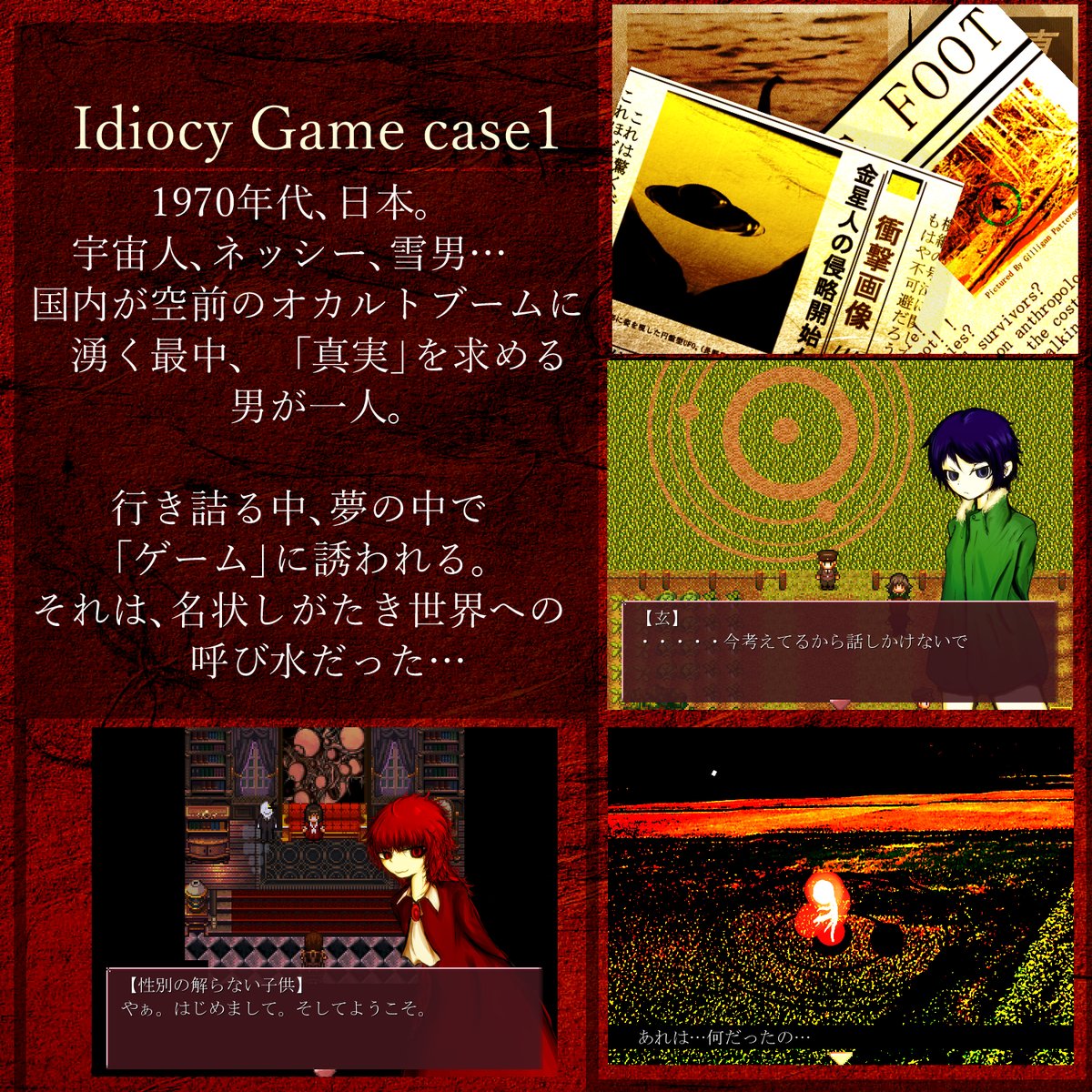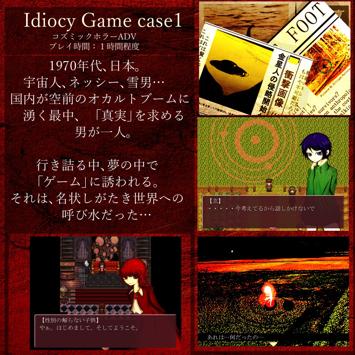 #作品をみてくださいあわよくばフォローしてください祭 #作品を載せて自分の作品を知ってもらおう 70年代の日本で「真実」に至るための「ゲーム」に挑む コズミックホラーADV作ってます。 宇宙人やらUMAやら出ます。