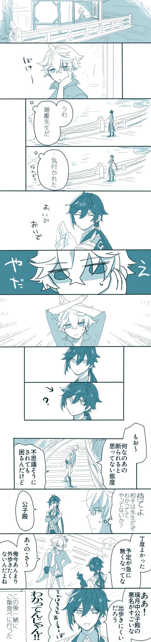一章三幕のあとおとなしく謹慎してるタルタリヤ見かけてマイペースに連れ出しちゃう鍾離先生のシーンかわいかったね