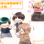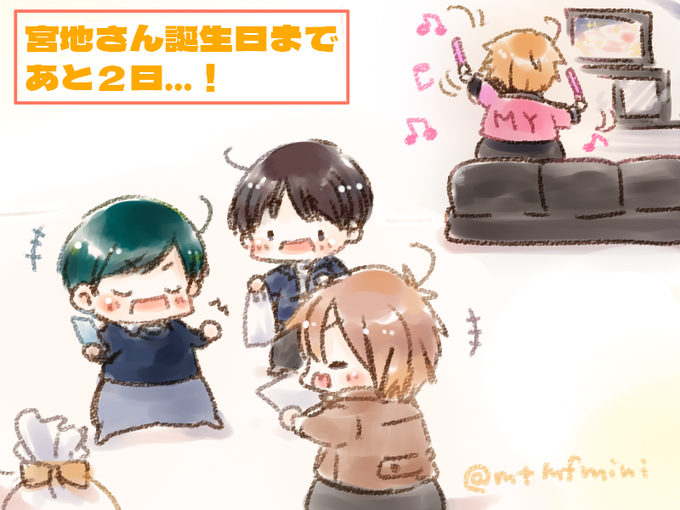 #宮地さん誕生日カウントダウン2022 ふくい「だいたい そろったな」 もりやま「いい かんじの みせも よやく できたぞ!」 いづき「プレゼントも ばっちり(・v・)」 こっそり おこなわれる たんじょうびの じゅんび・・・