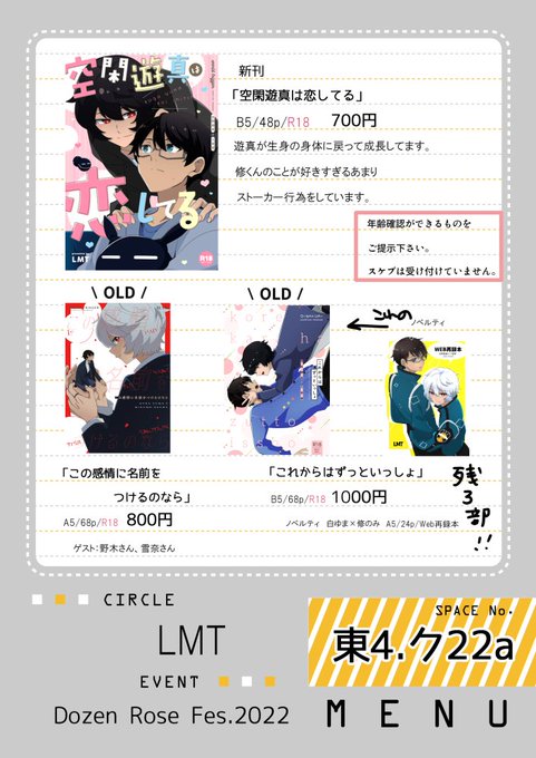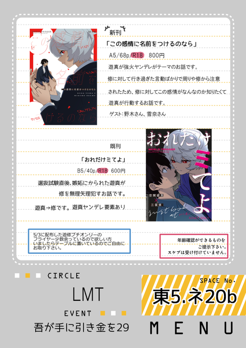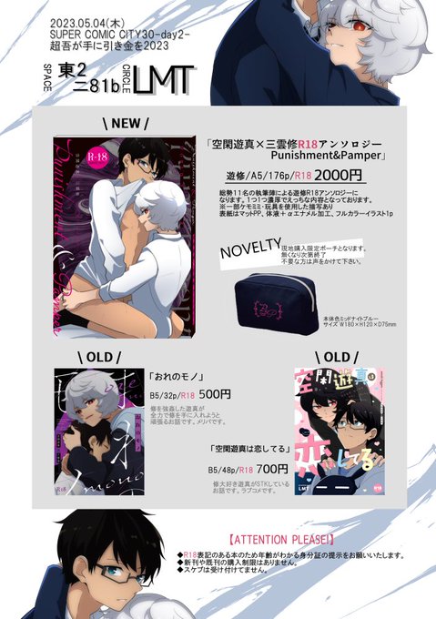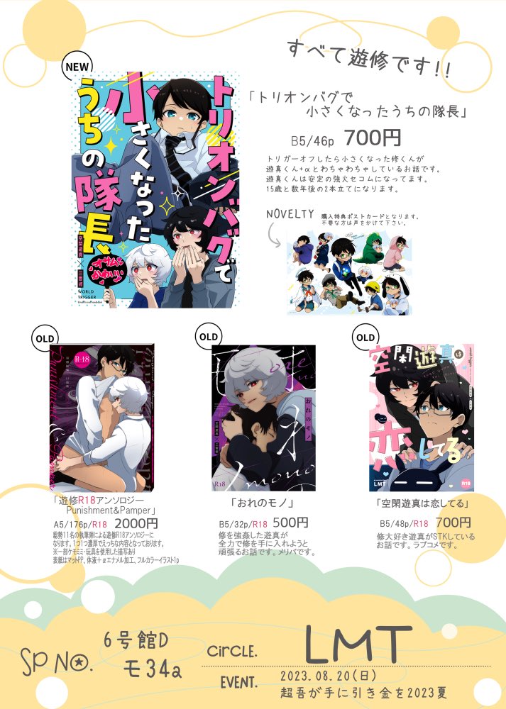 8/20のお品書きになります。 無配たぶんあります。ショタゆま×oさむ あと、昨年開催した遊修プチオンリーの開催記念品A4サイズのクリアファイル(絵柄はメインイラスト)少ないですが余っているのでよかったら持っていってください🙌 当日はよろしくお願いします🙇♀️ pixiv.net/artworks/11075… twitter.com/ymos220918/sta…