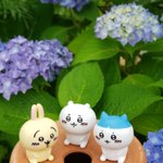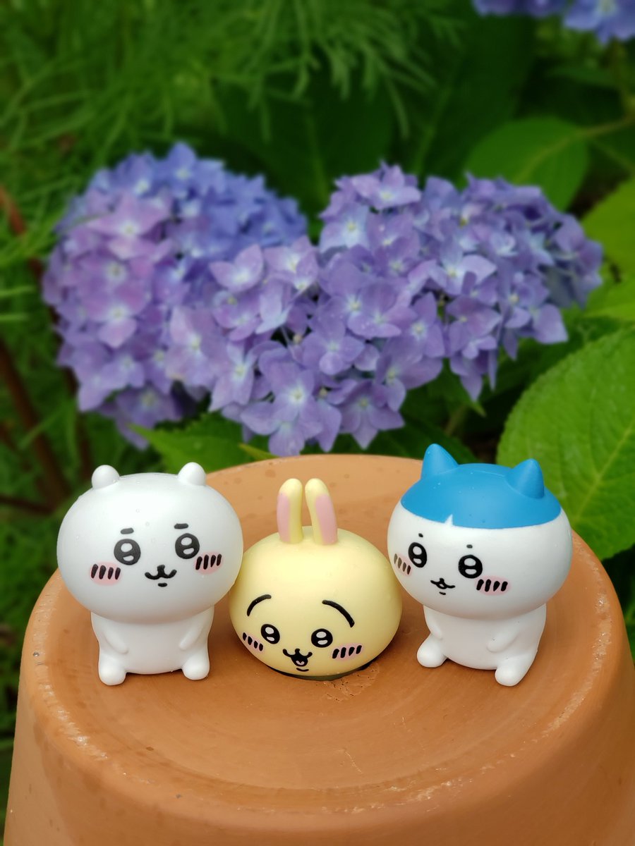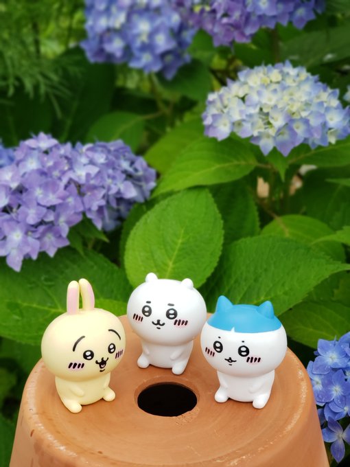 イー 🐰 庭の紫陽花が咲いたよ💜 勢い余って植木鉢の穴に落ちちゃったうさぎ...「なんかメロンパンみたいだよォ」と喜ぶパツワレちゃん 「プルルルル」と嬉しがってるうさぎ🐰 ちいちゃんはただただそれを優しく見守ってる💞 穏やかな時間が流れててサイコー #ちいかわ #ちいかわファンアート