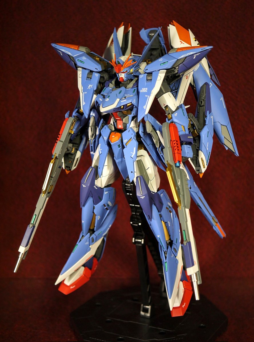HGUCシナンジュスタイン 撮影完了! オービタルと合体させました プロペラントタンクもごついブキヤタンクに変更 今回はNAZCAのフレイムレッドとコバルトバイオレットで鮮やか感出たかなと