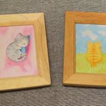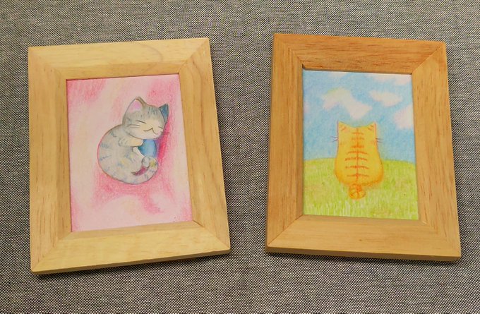 #イラスト #色鉛筆画 #ご報告 向かって右側の、ちっこい色鉛筆画(茶トラ)の原画、ご予約頂きました🎉 まさか地元に戻ってから里親が現れるとは😅 縁は異なもの…ですにゃ🙂 予約してくれてありがとうございます😚💕