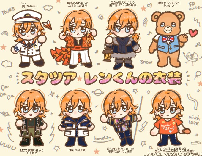 レンくんの衣装💃 描きながらどれも細かく作り込まれていて本当にすごいな〜と思った😭🧡