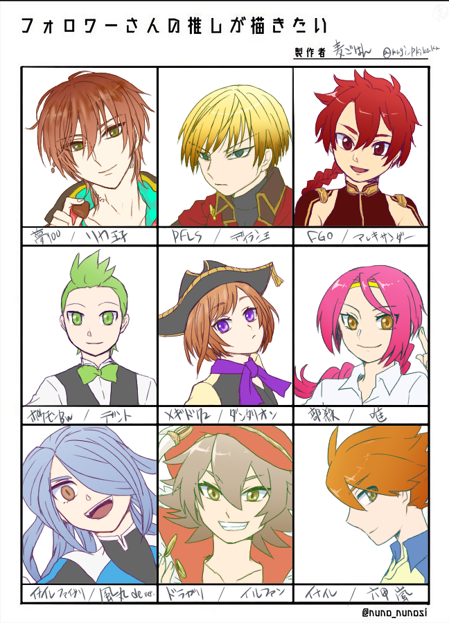 #フォロワーさんが推しを描きたい できました(夢100/リカ王子、PFLS/ディラン王、FGO/アレキサンダー、ポケモン/デント、メギド/ダンタリオン、部殺/唯、イナイレ2/DE風丸、ドラガリ/イルファン)と、空いてたので自分の推しをイナイレから六甲嵐 twitter.com/mugi_pkikaku/s…