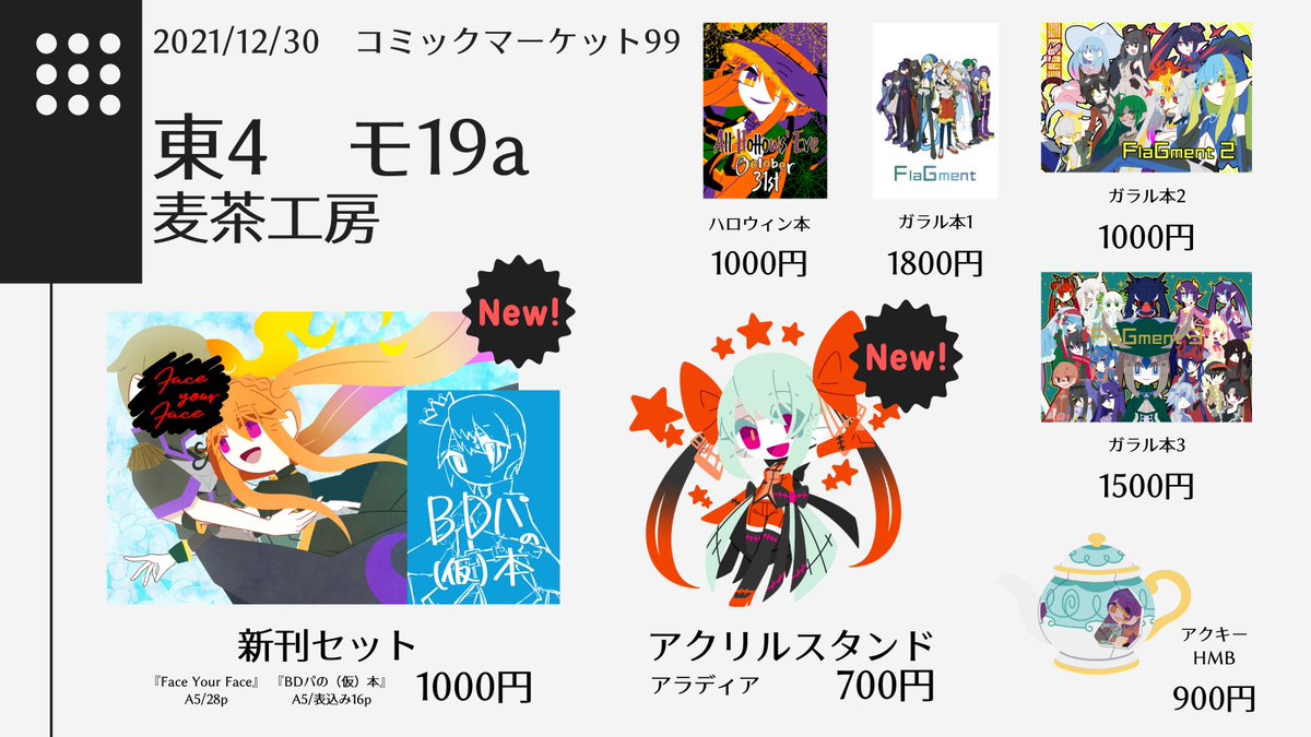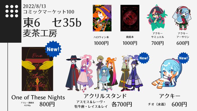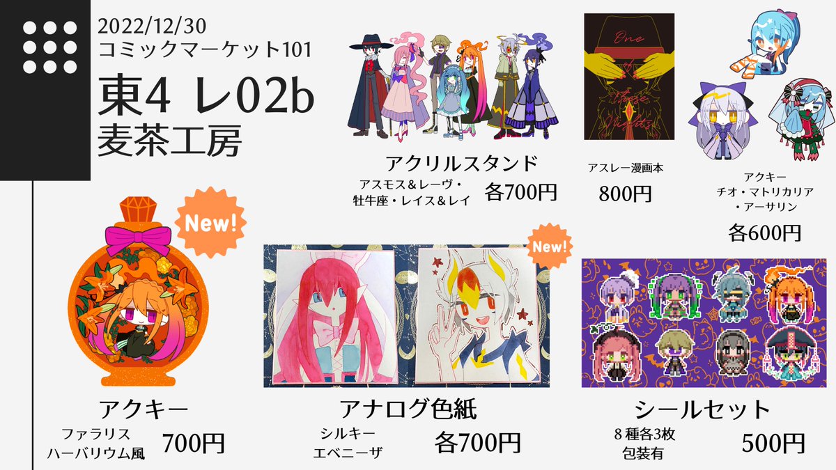 【コミケお品書き改訂版】 先日だした土曜の #C100 東セ35b「麦茶工房」にて頒布するもののお品書きに変更があります。ワンドロ本3のみ在庫の関係で持ち込み&通販ありません。他はそのままです!改めてよろしくお願いします! #C100新刊 twitter.com/mugi_titukihyd…