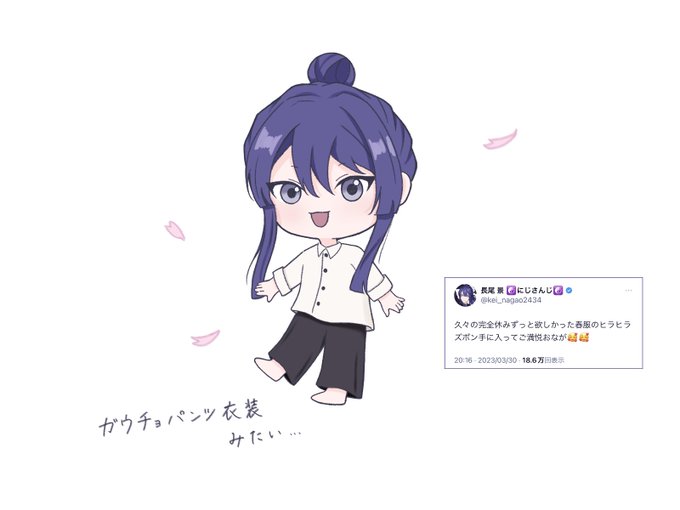 3 10 ヒラヒラのガウチョパンツ履いた推し見たいな......という絵 #長尾百景 23/04/03 19:37