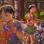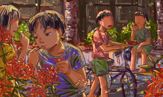 Childhood (2) : Ashoka Flowers 😊 "Did you know that the ashoka flower's nectar tastes sweet?" 😄 "Really? Let me try!" 🙄 "Hey, enough already! You're plucking too many flowers!" #artidn #ArtistsofSEA #ArtistOnTwitter