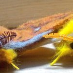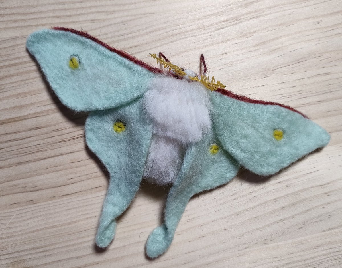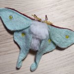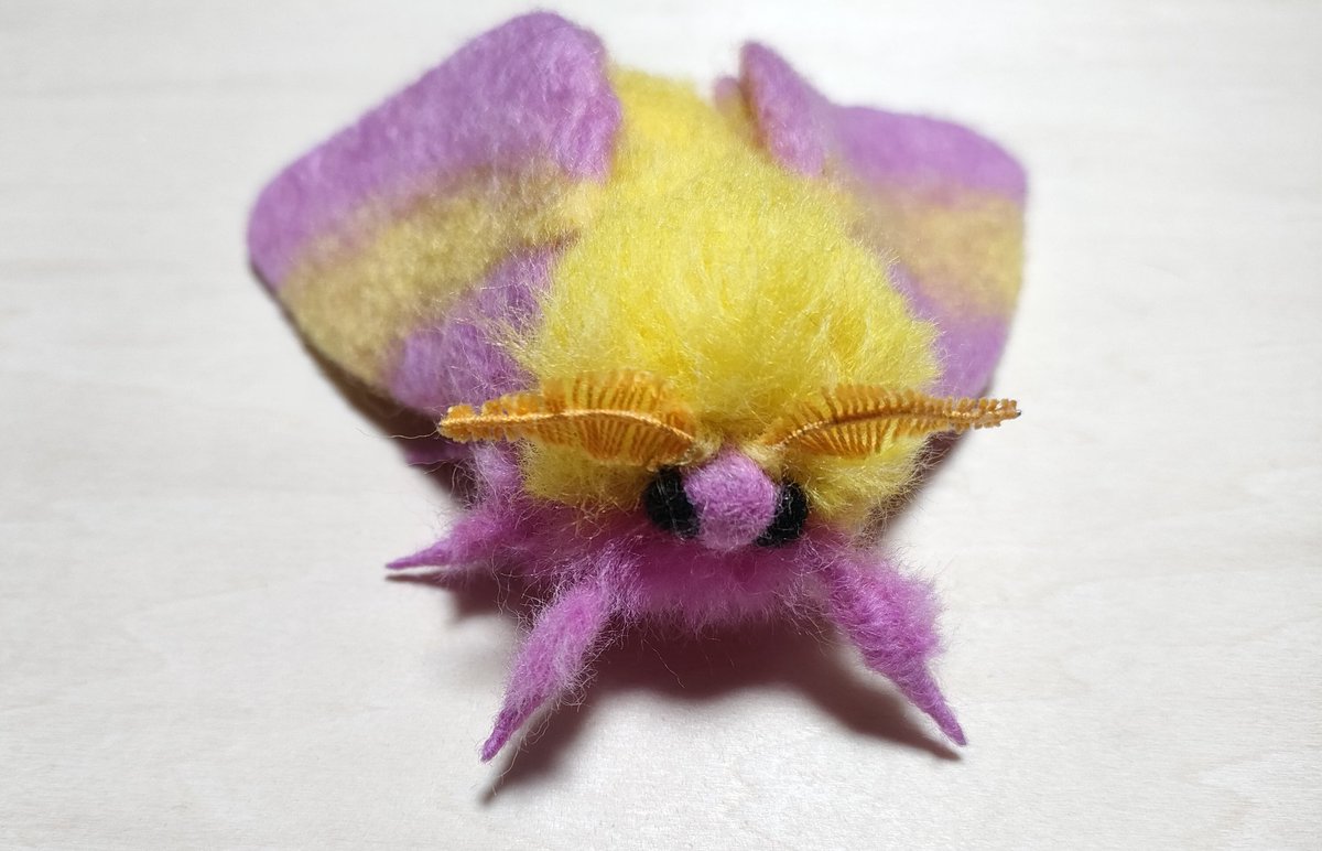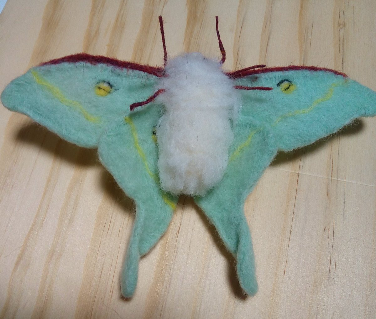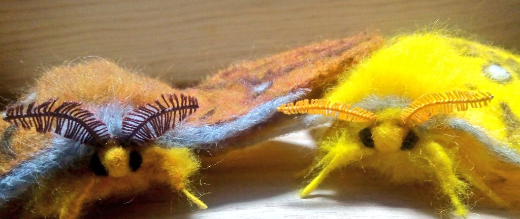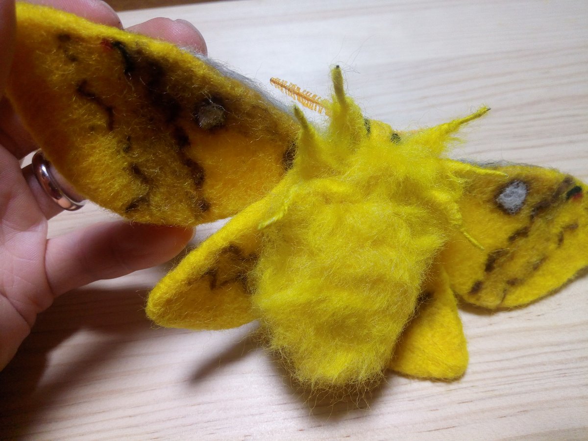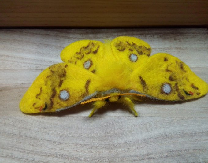 ハロウィンモチーフの作品完成しました! 翅はどうしようと悩んだ結果こうなりました モデルは蚕さん。白い子と並べると目立ちますね笑 首の周りはオレンジのふわふわ襟巻きみたいに😄 #羊毛フェルト #Halloween #蛾