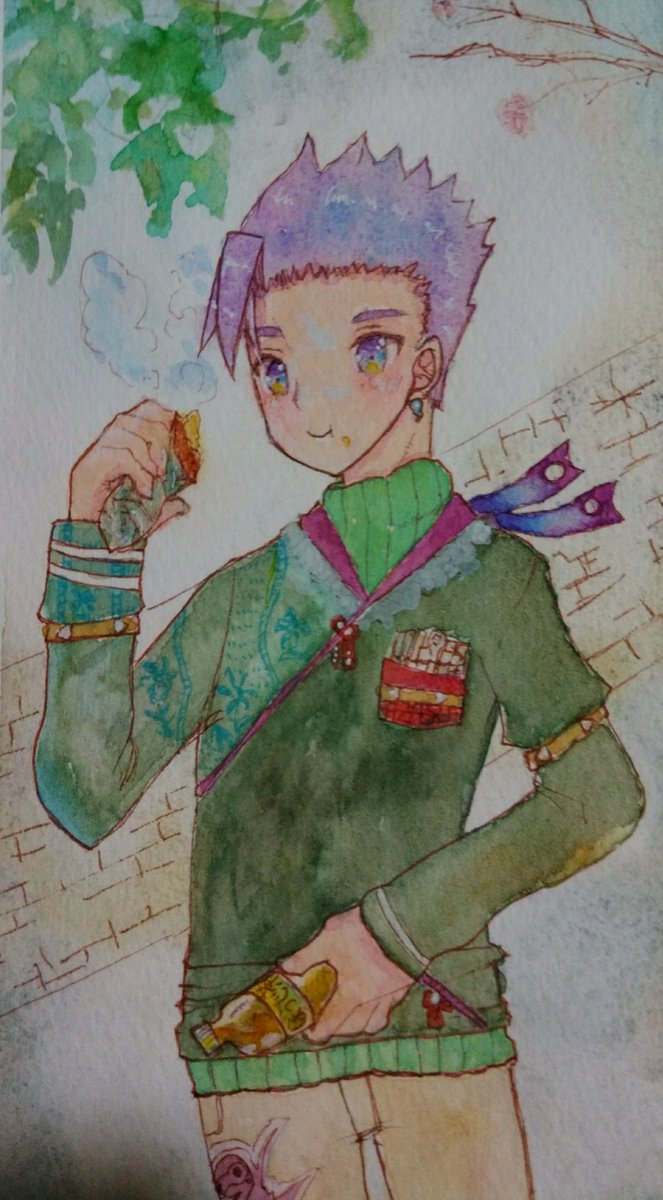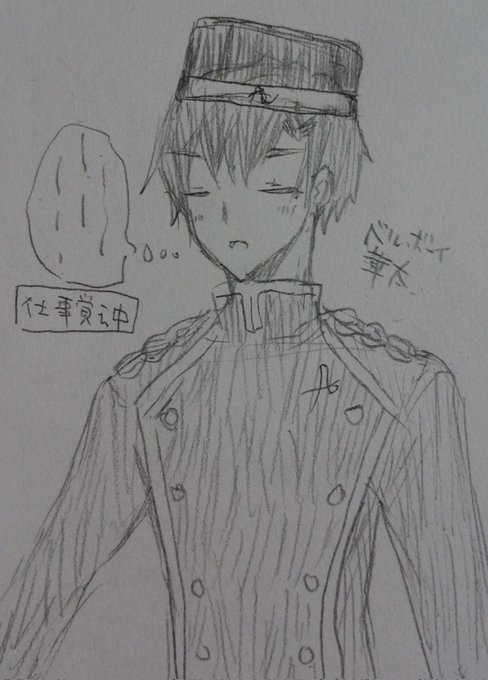 ソムリエ達に触発されてベルボーイ華太を描いてたりとか。 真面目だし細やかだから勤務初日をすごい完璧にこなしそう。 仕事前は瞑想、とか。 #バグ大アート科 #バグ大プラス #イラスト