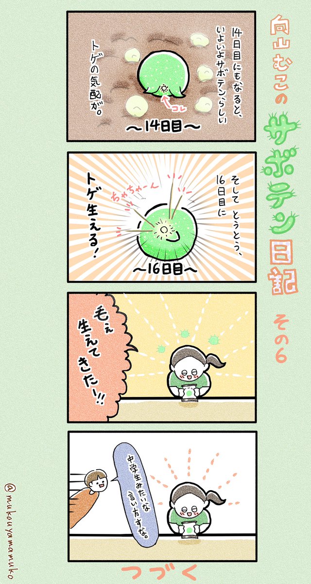 サボテン育成日記その6 トゲが生えてきた!! #栽培セット #サボテン #絵日記 #4コマ #漫画が読めるハッシュタグ #絵描きさんと繋がりたい #イラスト好きな人と繋がりたい #向山むこのサボテン育成日記