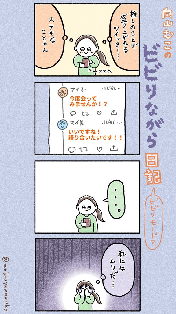 仲間意識を持つも、突然コミュ力を突きつけられて勝手に疎外感を感じるコミュ障 (今だと「リモートで話そうよ!」かな…🤔) #絵日記 #絵描きさんと繋がりたい #4コマ #コミュ障 #漫画が読めるハッシュタグ #向山むこのビビりながら日記