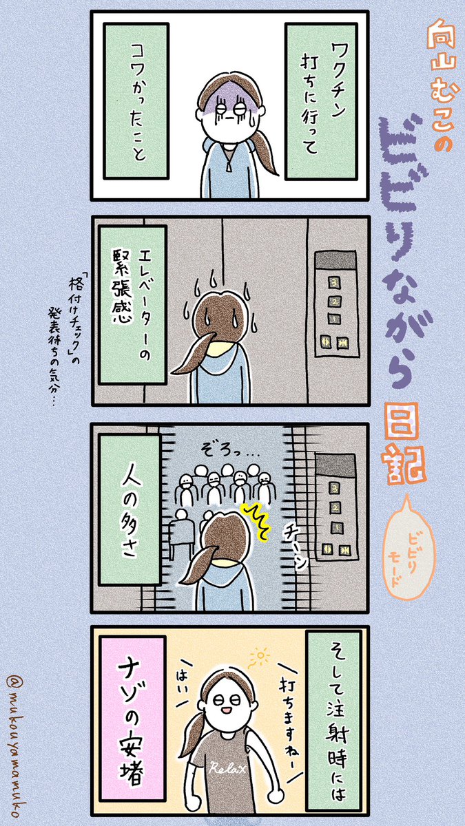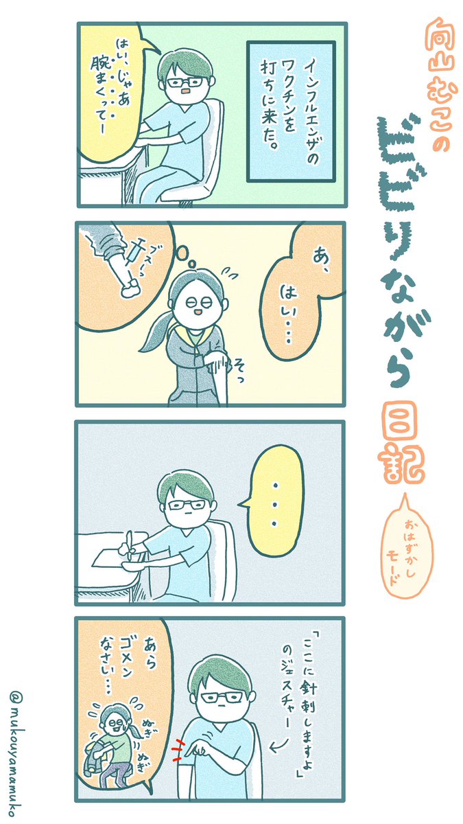 恥をかいただけであった。 (1ヶ月ぶり、2回目) (インフルエンザワクチン初めてでした。🙇♀️) #絵日記 #4コマ #エッセイ漫画 #漫画が読めるハッシュタグ #向山むこのビビりながら日記